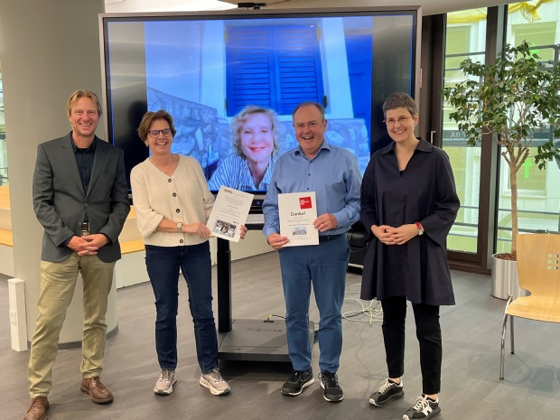 Dank an Anton Bausinger (von links nach rechts: André Szymkowiak, Annette Imhoff, Dr. Hannelore Vogt (digital), Anton Bausinger, Anja Flicker) © Stadtbibliothek Köln